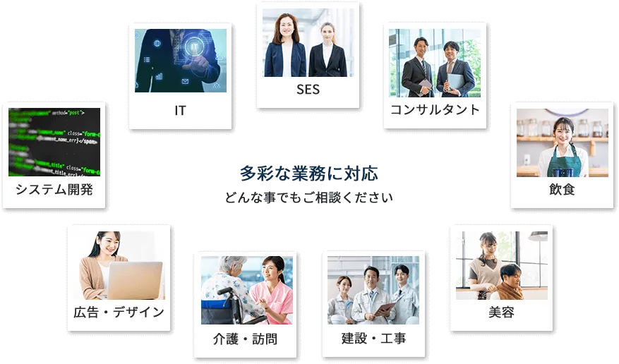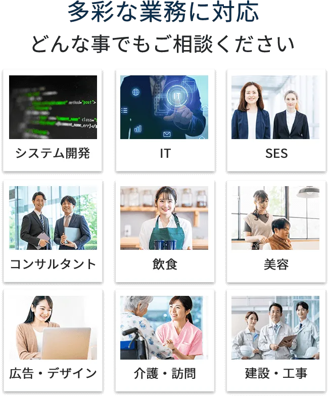 飲食業・カフェ / 内装工事・リフォーム会社 / 不動産仲介会社 / 板金加工 / 金型製造 / 理美容業 / 訪問看護サービス / 介護タクシー / ネイルサロン / イベント運営 /